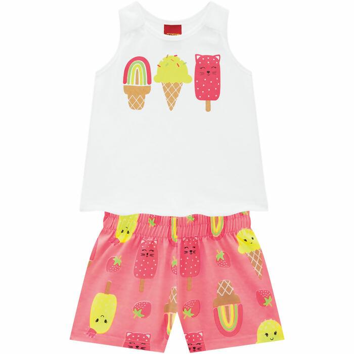 A Blusa Infantil Feminina Kyly possui modelagem trapézio, divertida estampa neon frontal de sorvetinhos, ombro deslocado para frente com um leve franzido e acabamento no decote e cavas com debrum. O Short Infantil Feminino Kyly possui colorida estampa neon com rotativa de sorvetinhos e cós com elástico confortável para sua criança.