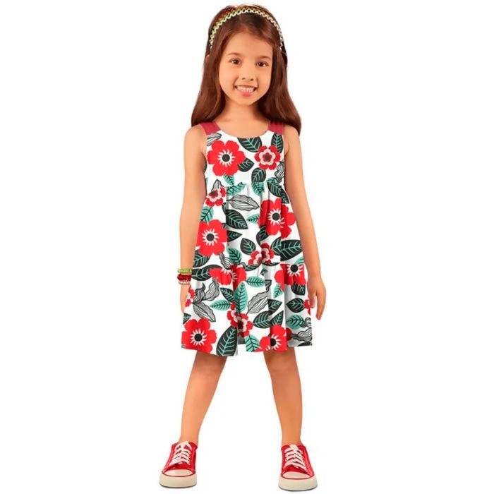 Vestido Infantil Kyly confeccionado em Meia Malha, possui recortes de pala com franzido frente e costas deixando a peça soltinha, colorida estampa neon com rotativa floral e folhagens e acabamento no decote, alças e cavas com debrum.