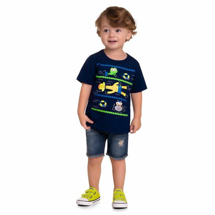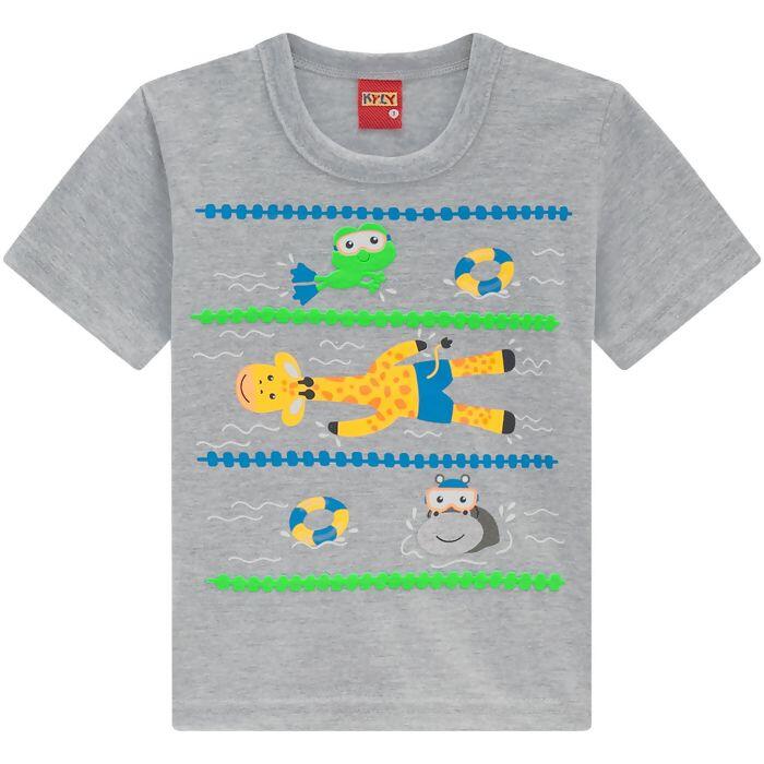 Camiseta Infantil Masculina Kyly confeccionada em Meia Malha, possui modelagem tradicional, divertida estampa frontal de animaizinhos e acabamento no decote com debrum.
