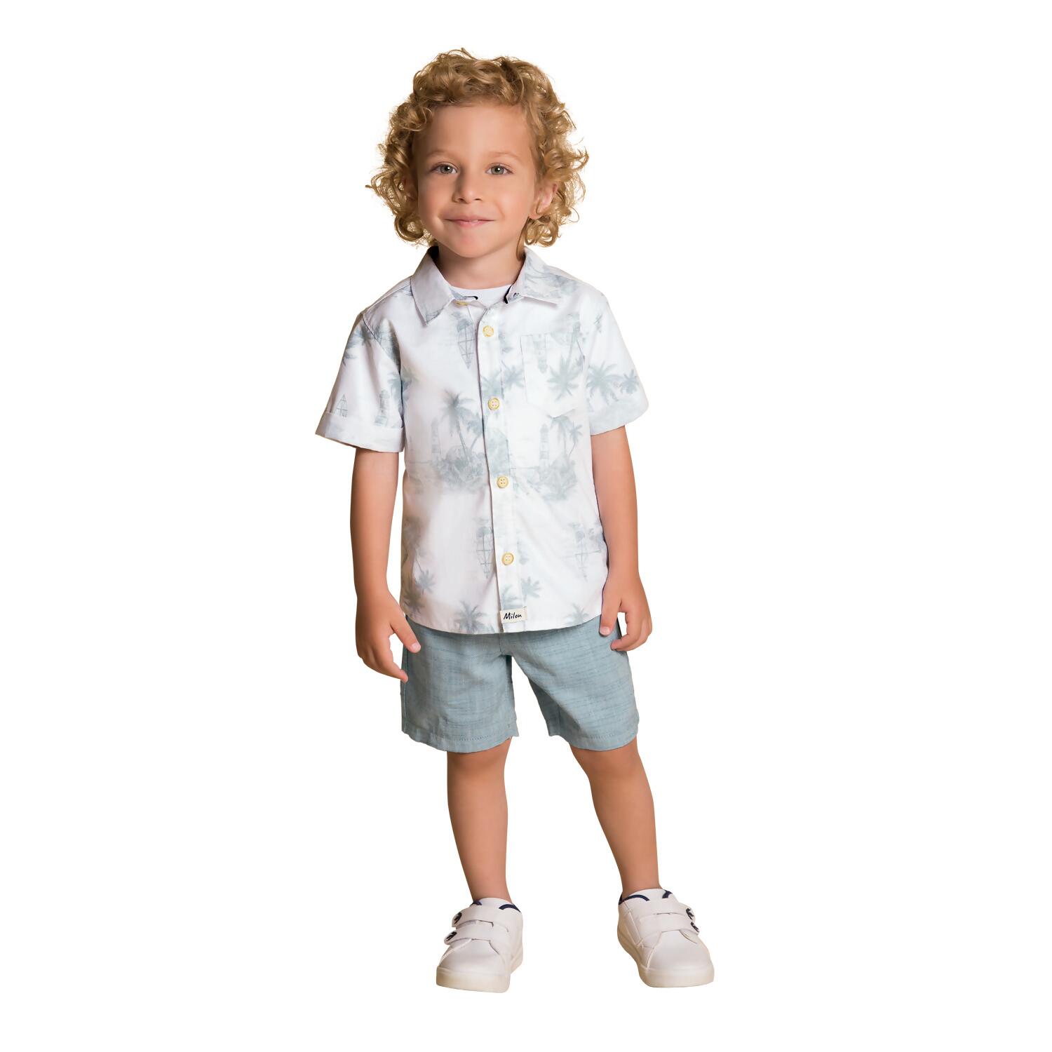 A Camisa Infantil Masculina Milon possui estampa rotativa, mangas dobradas, etiqueta decorativa, bolso na altura do peito e abertura frontal com fechamento por botões. A Bermuda Infantil Masculina Milon possui efeito mesclado, bolsos funcionais, abertura de cós por botão e elástico ajustável.