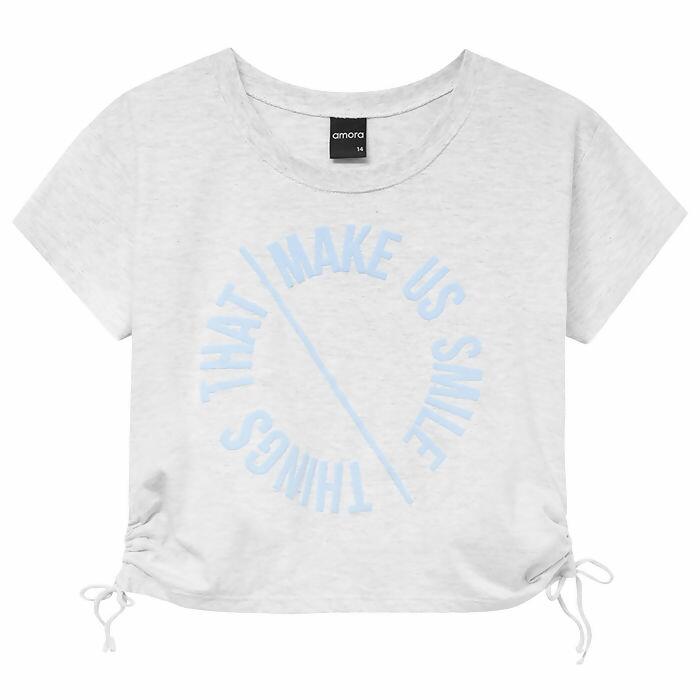 A Blusa Teen Feminino Amora é composto por Blusa em Meia Malha na modelagem de Cropped, com estampa relevo escrita: Make us Smile Things Thats ¿Coisas que fazem a gente sorrir¿.