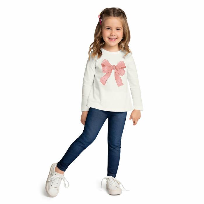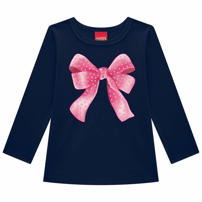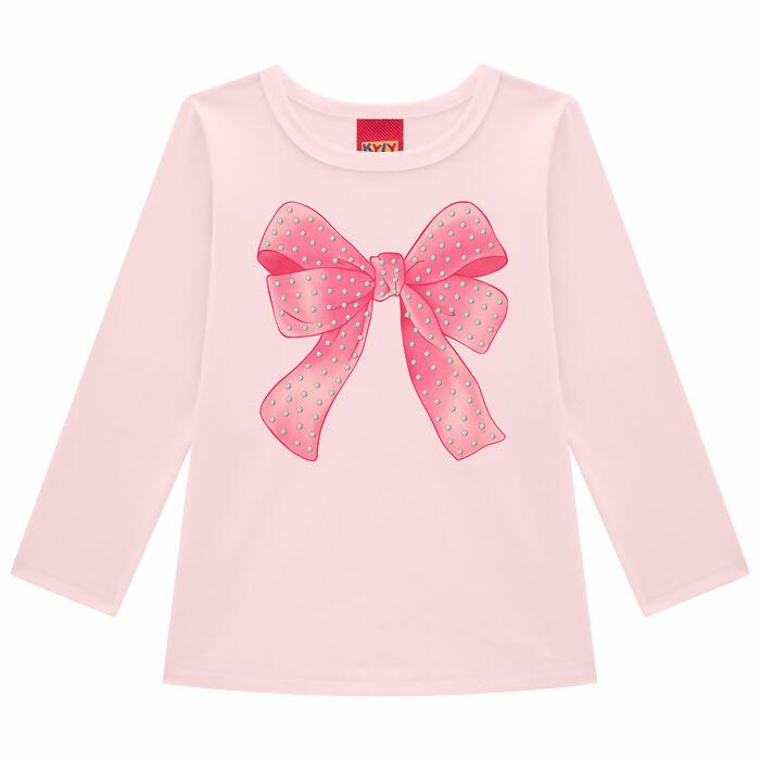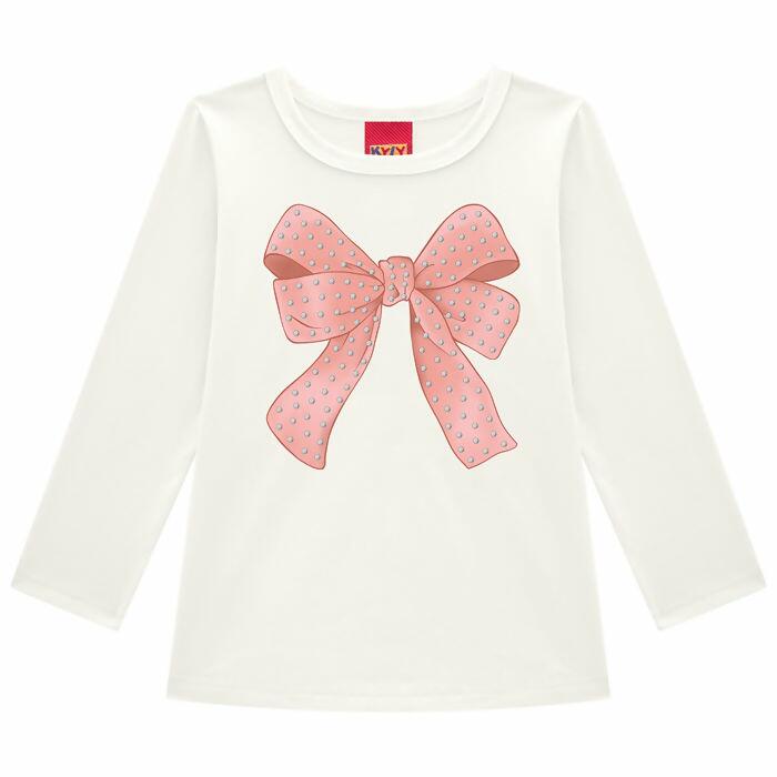 Encante suas clientes com a blusa feminina manga longa em malha 100% algodão, com estampa localizada de laço decorado com strass. Uma peça que combina conforto e brilho, perfeita para looks elegantes e versáteis.