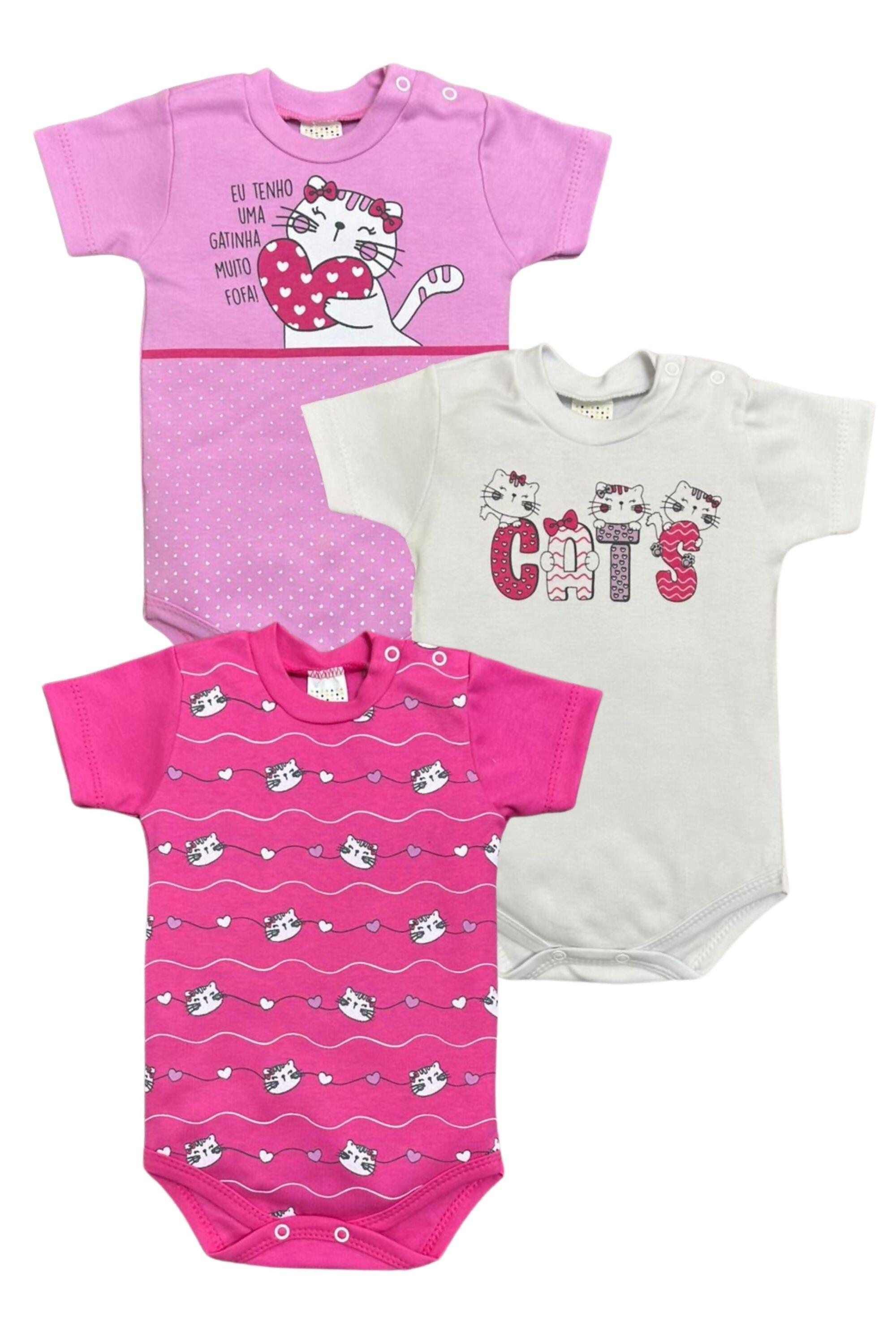 Kit com três bodies femininos confeccionados em malha macia, com estampas encantadoras de gatinhos. O modelo oferece conforto e praticidade, ideal para o uso diário. Disponível nos tamanhos RN ao EX.