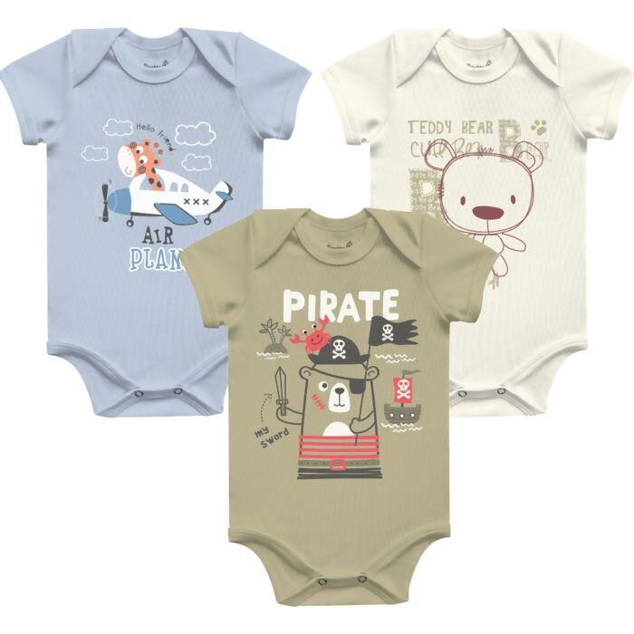 Descrição Body Manga Curta Masculino PIRATA com 3Un. RN ao GG Coordena com 06038 Doctor Baby | 02038VERÃO 2023