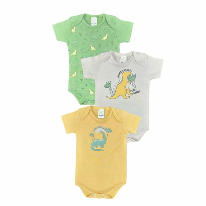 Kit com três bodies infantis masculinos com temática de dinossauros, confeccionados em malha leve e confortável. Modelagem prática com ombro transpassado e fechamento por botões de pressão. Cores vivas e estampas divertidas que se destacam no ponto de venda.