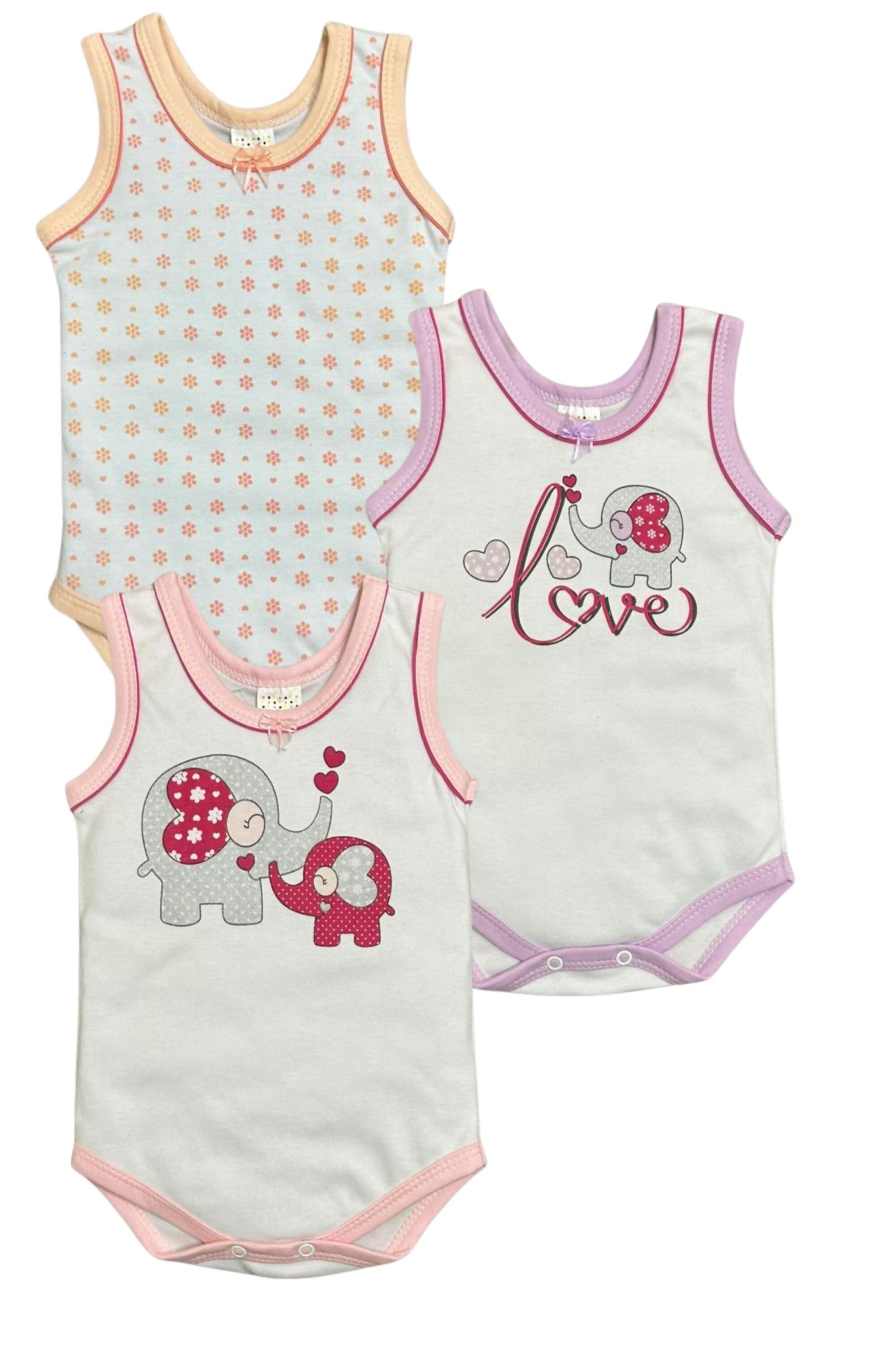 Kit com três bodies regata confeccionados em malha leve e fresca, com estampas delicadas de elefantinhos. Modelo ideal para os dias mais quentes, oferecendo conforto e liberdade de movimentos.