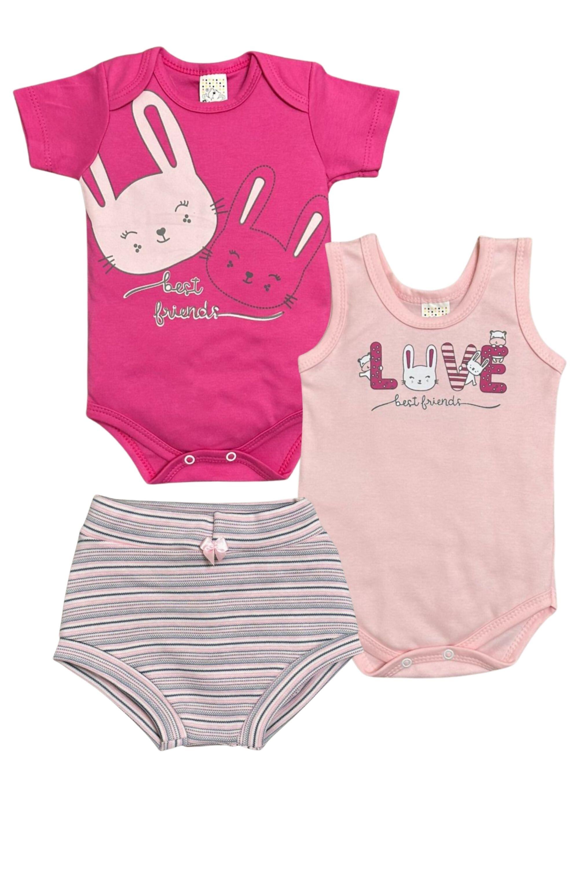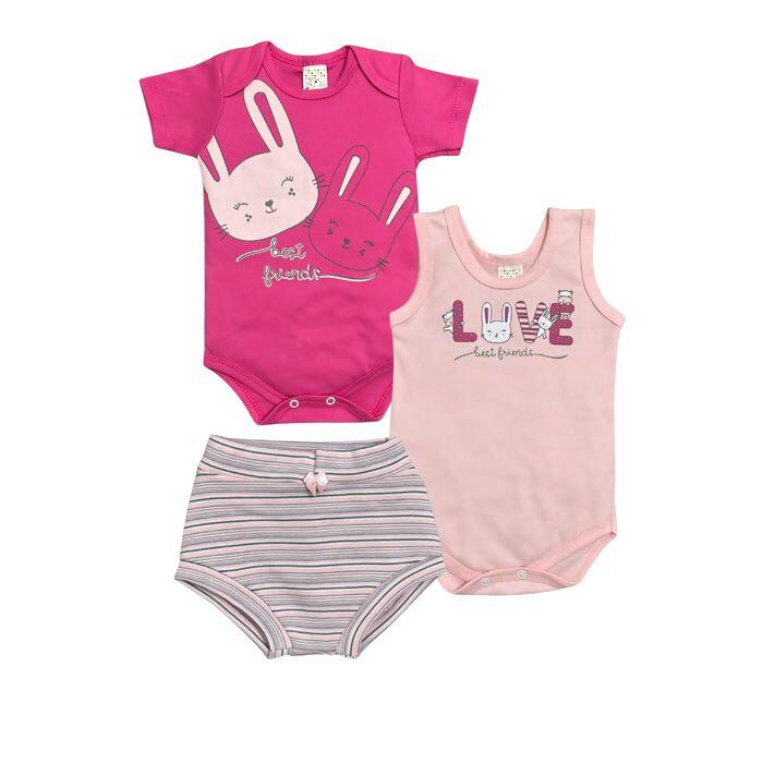 Kit com três bodies femininos confeccionados em malha macia 100% algodão. As estampas delicadas com tema ¿Love¿ trazem um toque de doçura às produções. Fechamento em botão de pressão para mais praticidade no vestir.