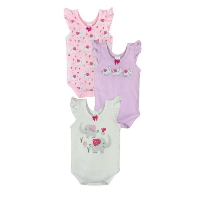 Kit com 3 bodies regata confeccionados em malha leve e macia, ideais para os dias mais quentes. As peças possuem estampa de elefantinhos delicados, babadinhos nos ombros e laço decorativo no decote. Abertura inferior com botões de pressão para facilitar a troca.