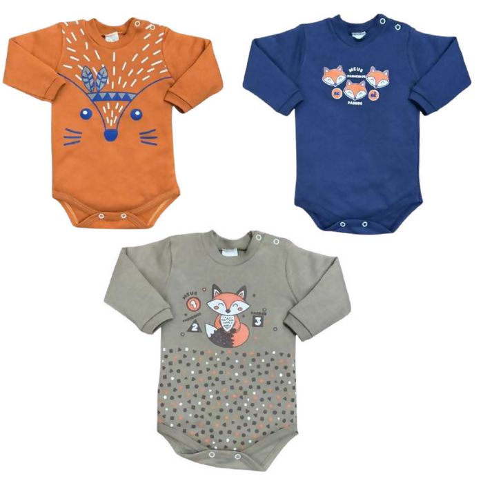Kit com 3 bodies RN a EX de manga longa, desenvolvido para coordenar com os culotes da mesma linha. Peças essenciais para o mix básico da linha bebê, com excelente vestibilidade e alta aceitação no varejo infantil.