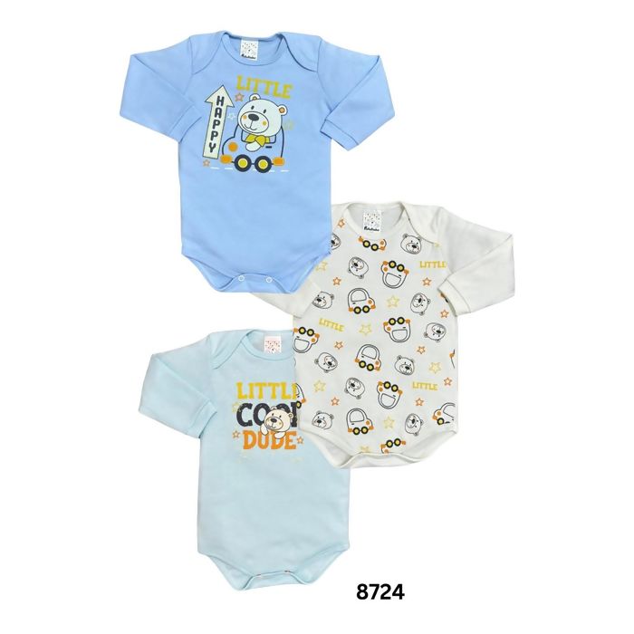 Kit com três bodies de manga longa confeccionados em material confortável, proporcionando bem-estar e praticidade para a rotina do bebê. A modelagem facilita o vestir, enquanto o acabamento de qualidade valoriza a peça no ponto de venda. Um produto essencial com excelente aceitação no mercado infantil.