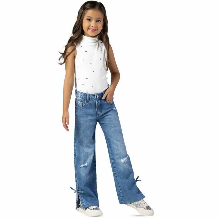 Calça infantil feminina em jeans com modelagem wide leg, tendência forte na moda atual e que traz um visual moderno e estiloso para o público infantil. A peça apresenta caimento solto e confortável, além de acabamento de qualidade que valoriza a apresentação no ponto de venda. Uma ótima escolha para lojistas que buscam peças alinhadas às tendências da moda.
