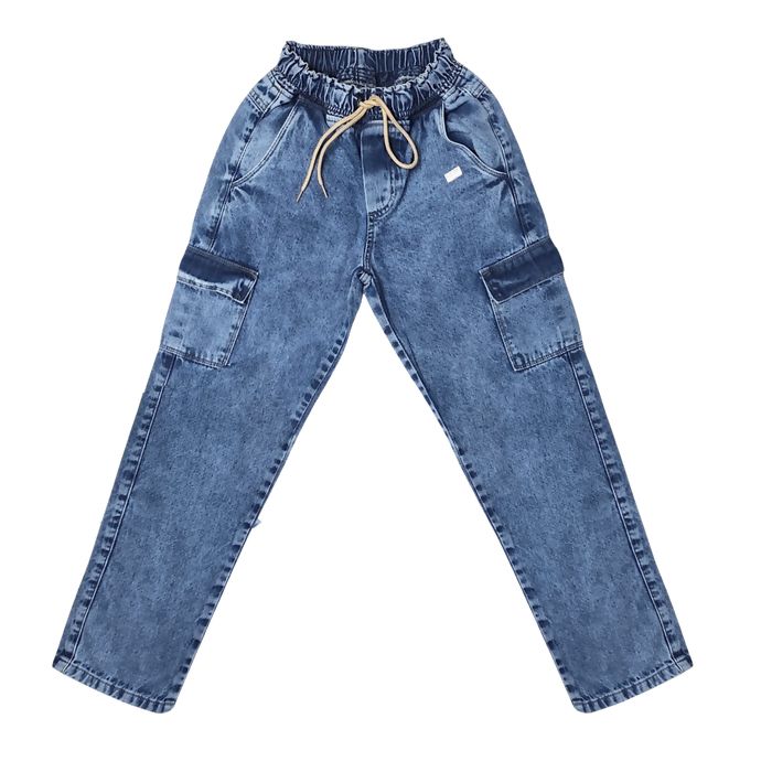 Calça masculina juvenil estilo cargo, com elástico total na cintura para maior conforto e ajuste perfeito. O modelo une praticidade e estilo, ideal para o dia a dia.