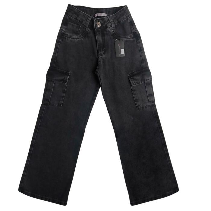 Calça Feminina Wide leg Jeans Cargo Infantil Preta com Bolsos Utilitários