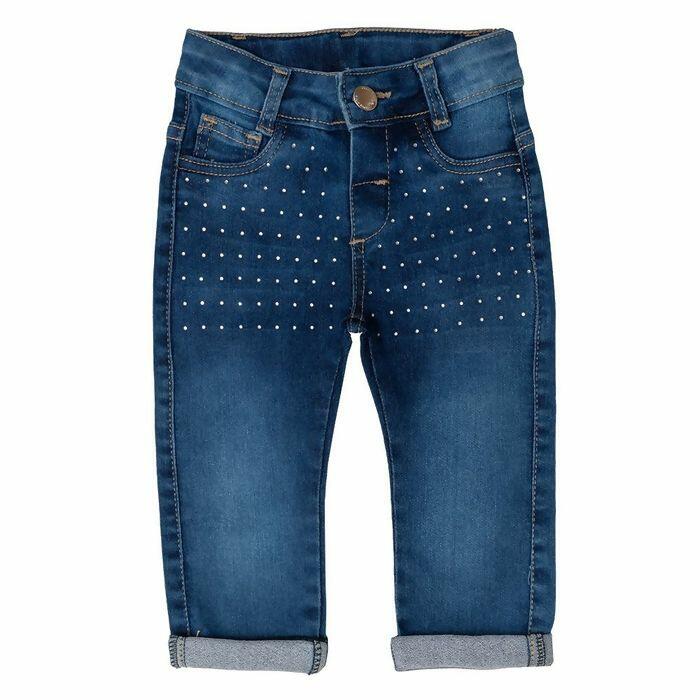 A calça jeans chegou no universo infantil como uma peça curinga, perfeita para diversas combinações e confortável para o dia a dia. Esse modelo foi elaborado em tecido jeans. Sua lavagem escura, barras dobradas e detalhes em Strass combina com qualquer look e o deixa ainda mais lindo! A calça possui botão e zíper no cós.