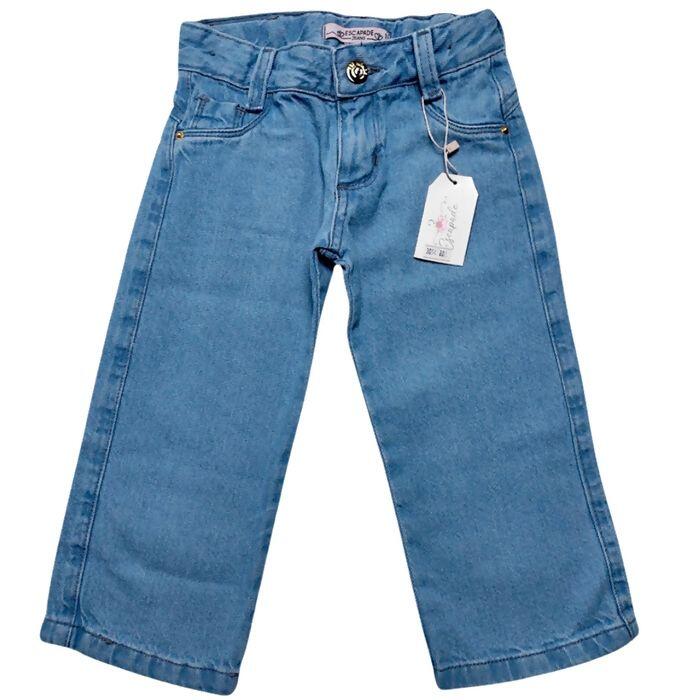 Calça jeans Wide Leg feminina infantil Escapade com modelagem reta e lavagem azul clara, ideal para composições casuais. Detalhe de botão metálico com coração, passantes para cinto e bolsos frontais e traseiros funcionais, proporcionando praticidade e estilo. Excelente opção para lojistas que buscam produtos versáteis e de qualidade. Consulte Nossa Equipe de Vendas para mais informações e condições especiais.