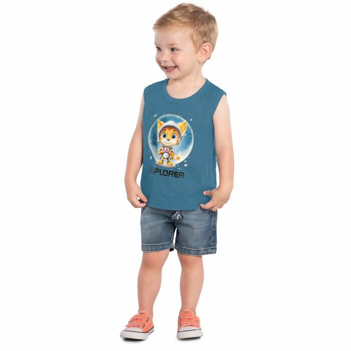 Leve a imaginação das crianças às alturas com a Regata Infantil Masculina! A estampa centralizada de um gatinho astronauta com a palavra "Explorer" é divertida e moderna, perfeita para pequenos aventureiros. Confeccionada em tecido leve, é uma escolha ideal para o verão e para os lojistas que buscam produtos diferenciados e cativantes.
