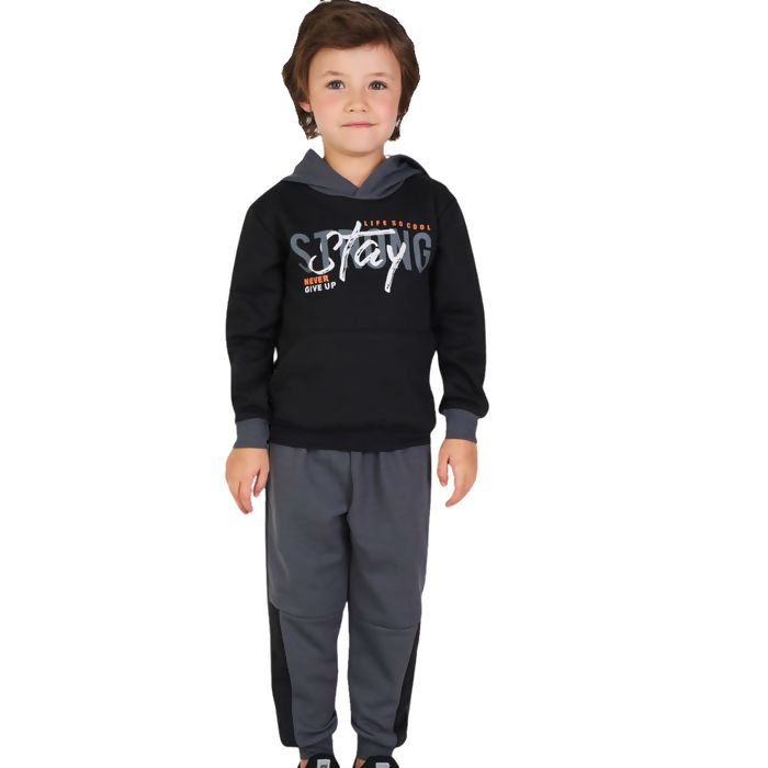 Conjunto infantil masculino com capuz, desenvolvido para oferecer conforto térmico e praticidade. Modelo com visual atual e ótima aceitação no varejo infantil, ideal para lojistas que desejam fortalecer o mix com produtos versáteis.