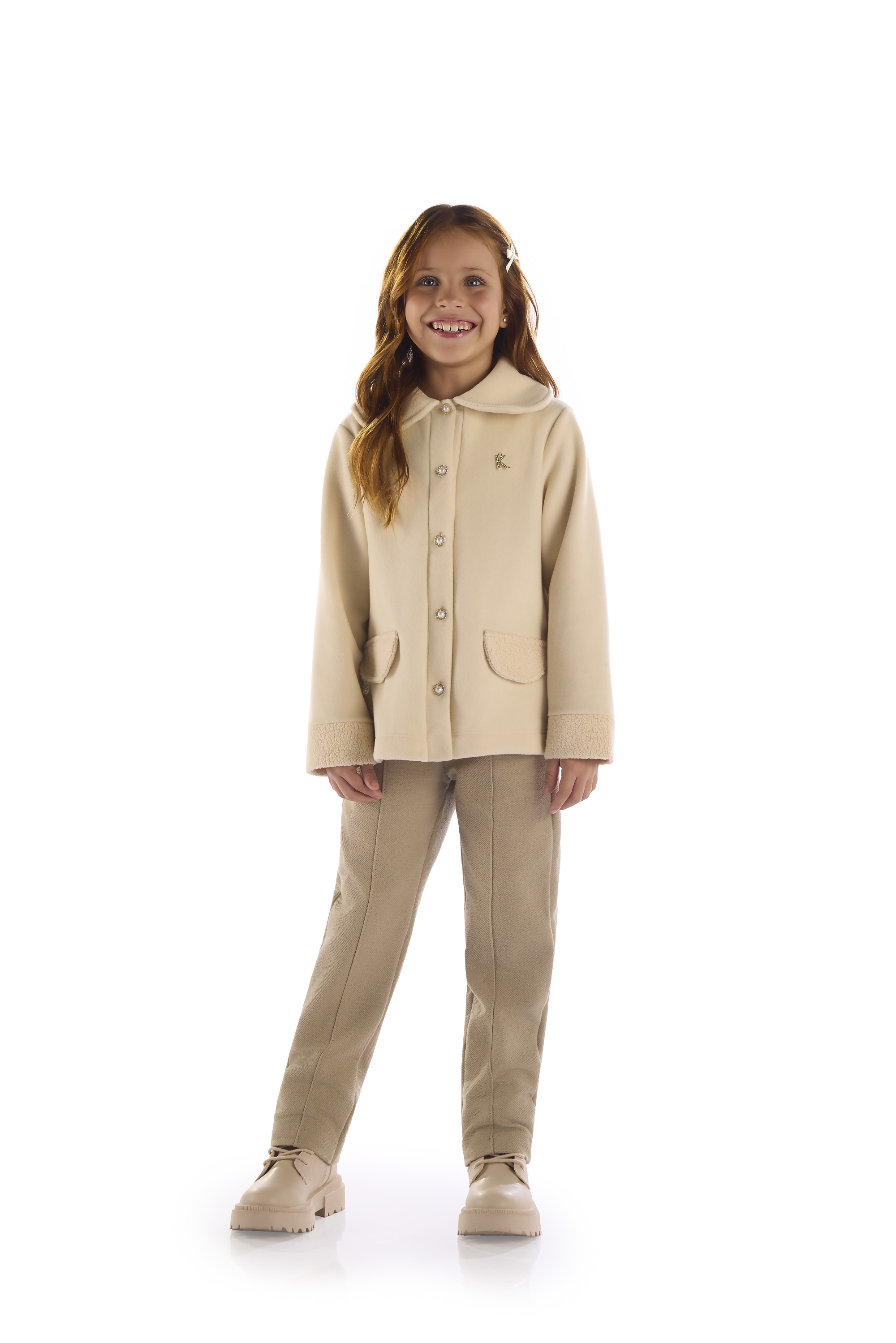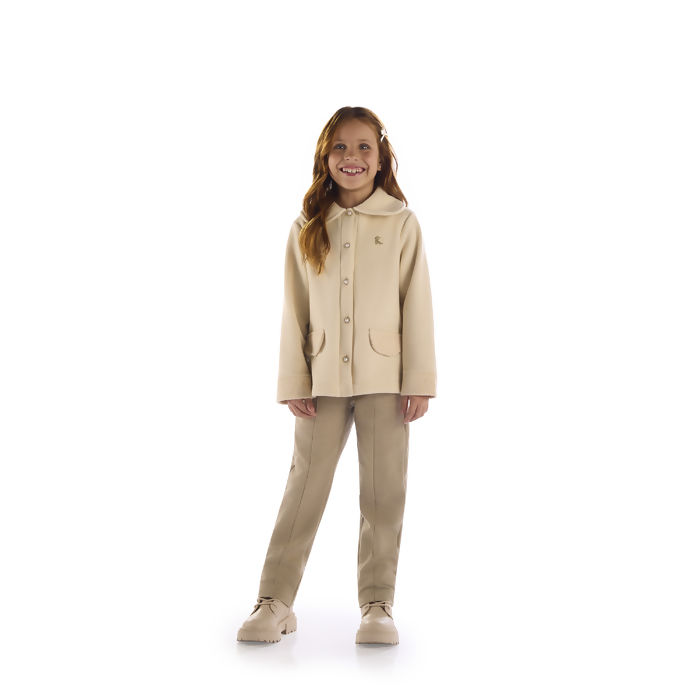 Conjunto infantil feminino composto por casaco com fechamento em botões e acabamento sofisticado, trazendo um visual clássico e elegante. Desenvolvido com atenção aos detalhes, é uma peça que transmite requinte e qualidade, ideal para lojistas que atendem um público que busca moda infantil premium.
