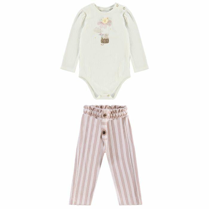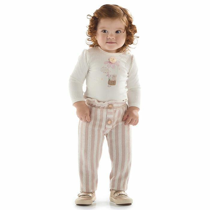 Conjunto bebê feminino encantador, ideal para lojistas e revendedores que buscam qualidade e estilo. Body em malha texturizada, suave e confortável, combinado com calça em malha listrada, oferecendo praticidade e charme. Perfeito para atrair pais que procuram peças modernas e confortáveis para seus bebês. Aproveite condições exclusivas de atacado e aumente suas vendas com este item irresistível!