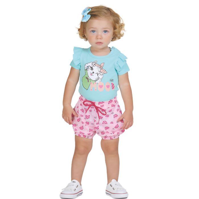 Conjunto bebê feminino Viston composto por blusa com detalhe delicado nas mangas e short com ajuste prático na cintura.