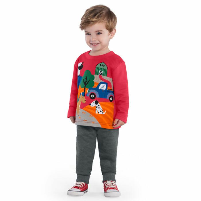 O Casaco Infantil Masculino Kyly possui modelagem tradicional, divertida estampa frontal e capuz. A Calça Infantil Masculina Kyly possui barra em molde e elástico confortável no cós para maior conforto da criança.