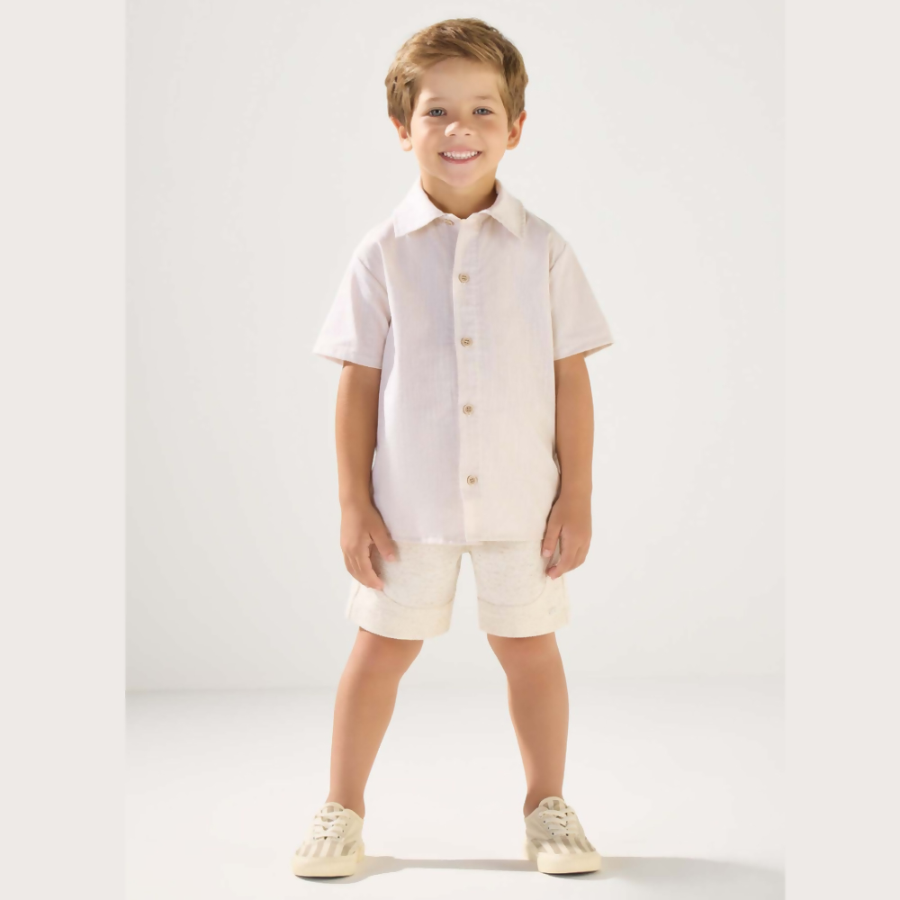 Conjunto de alto padrão que veste do 1 ao 4, desenvolvido para composições elegantes e atemporais. A camisa de botões possui corte clássico e acabamento limpo, enquanto a bermuda apresenta detalhe texturizado na barra, agregando sofisticação com um toque de modernidade. Uma proposta ideal para lojistas que buscam traduzir bom gosto e requinte nas vitrines voltadas ao público infantil.