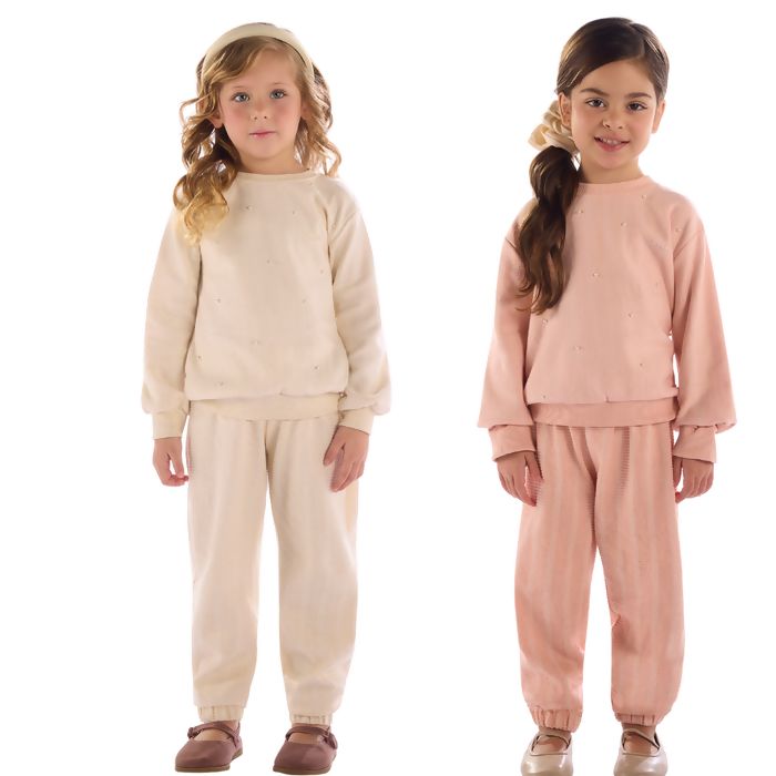 Conjunto sofisticado de inverno, com blusão adornado por pérolas que elevam o visual da peça. A calça complementa o conjunto com caimento impecável, resultando em uma proposta elegante e funcional para coleções premium infantis.