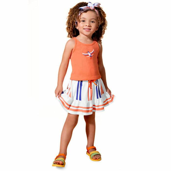 Conjunto Infantil Nanai é confeccionado em ribana canelada, possui modelagem cropped com bordado, acabamento frente e costas e nas mangas, shorts saia com uma divertida estampa rotativa e laço.