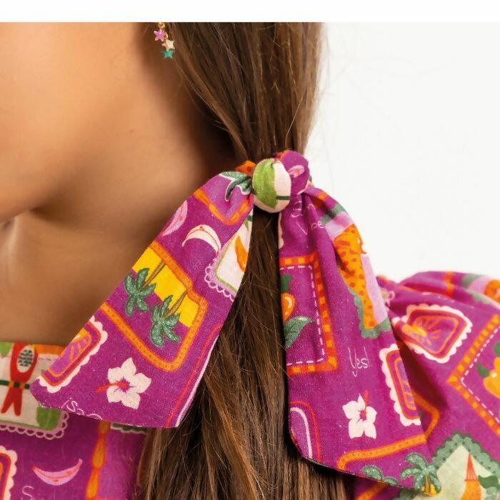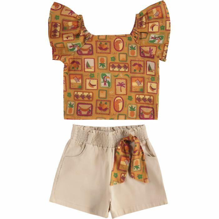 Conjunto juvenill Feminino Dila com blusa ciganinha e lenço removível como acessório, acompanhado de short em sarja com elastano para maior conforto. Disponível nos tamanhos 12 ao 16. Consulte nossa equipe de vendas para mais informações.