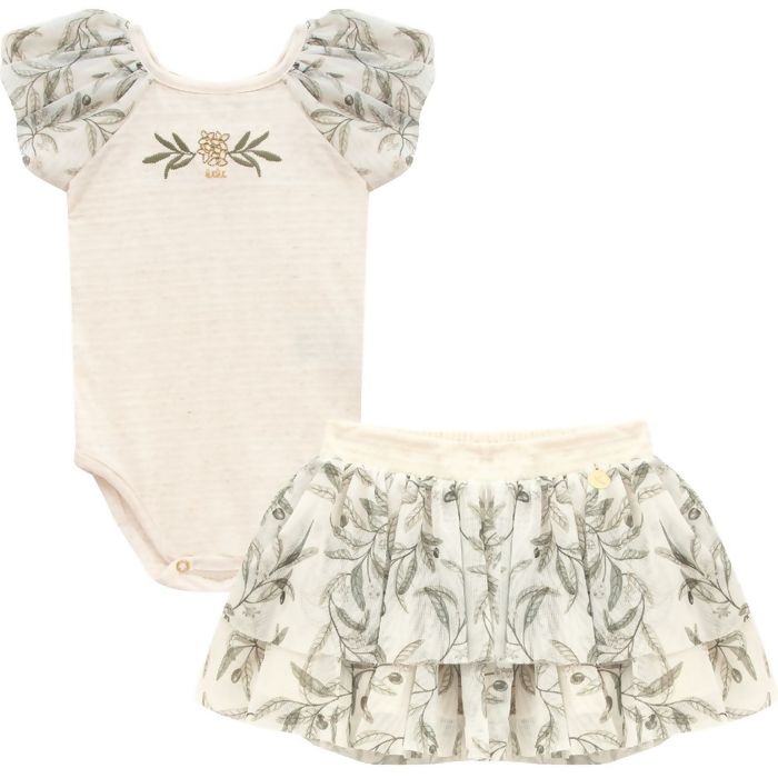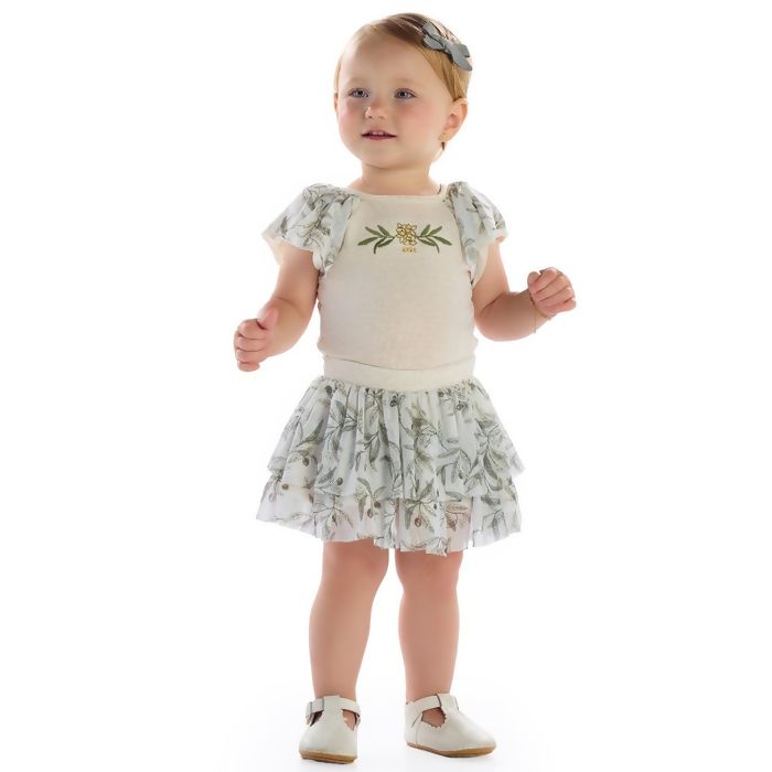 Descrição Conjunto Feminino P ao G com Body e Saia de Babados Estampada Kiki Xodó | 1400010
