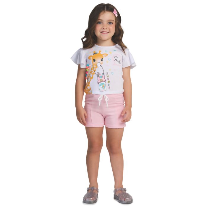 Conjunto feminino composto por shorts e blusa com estampa delicada de girafa e detalhe interativo que encanta.