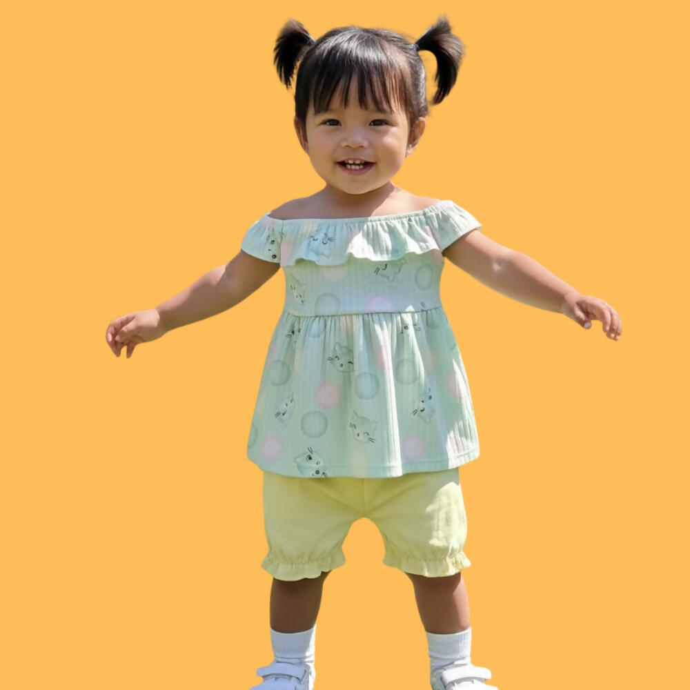 Conjunto feminino bebê composto por bata com estampa de gatinha e short confortável. Confeccionado em tecido leve e macio, o modelo oferece praticidade e um toque delicado para o enxoval.