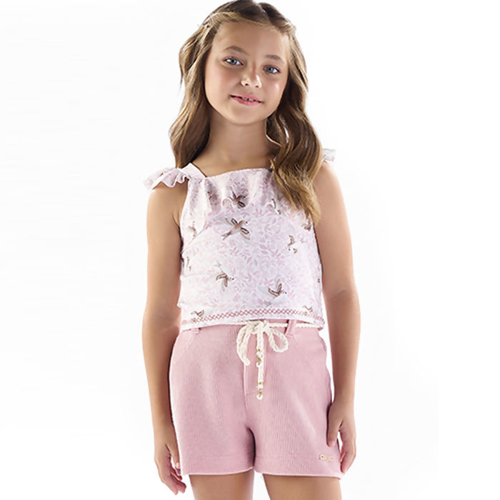Atraia os olhos dos seus clientes com o encantador conjunto feminino infantil da Kiki Xodó! Confeccionado em jacquard de alta qualidade, a blusa estampada com manga de babado e acabamento em debrum é um verdadeiro destaque de estilo. O shorts liso, complementado com um cinto elegante, oferece um visual moderno e confortável. O toque final fica por conta do pingente exclusivo da marca, garantindo um detalhe único e especial. Ideal para lojistas que buscam agregar sofisticação e charme ao seu portfólio. Venha fazer parte da moda Kiki Xodó!