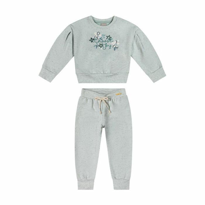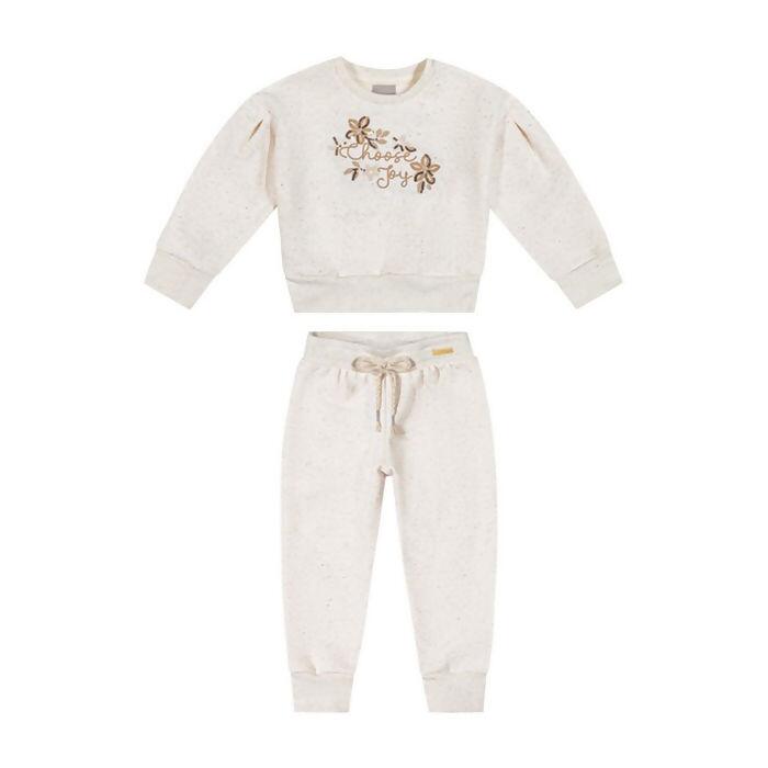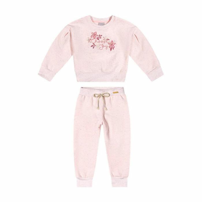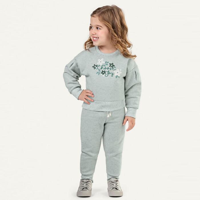 O Conjunto Moletom Infantil Feminino Colorittá é ideal para lojistas que buscam oferecer conforto e estilo para o público infantil. O blusão, confeccionado em linho felpado, traz uma estampa puff e bordado de lantejoulas com a mensagem "Choose Joy", proporcionando um toque moderno e alegre. A calça, com cadarço de franja e lurex, adiciona brilho discreto e sofisticação ao visual.