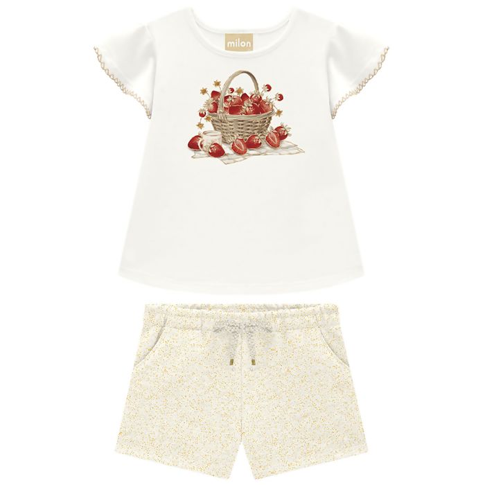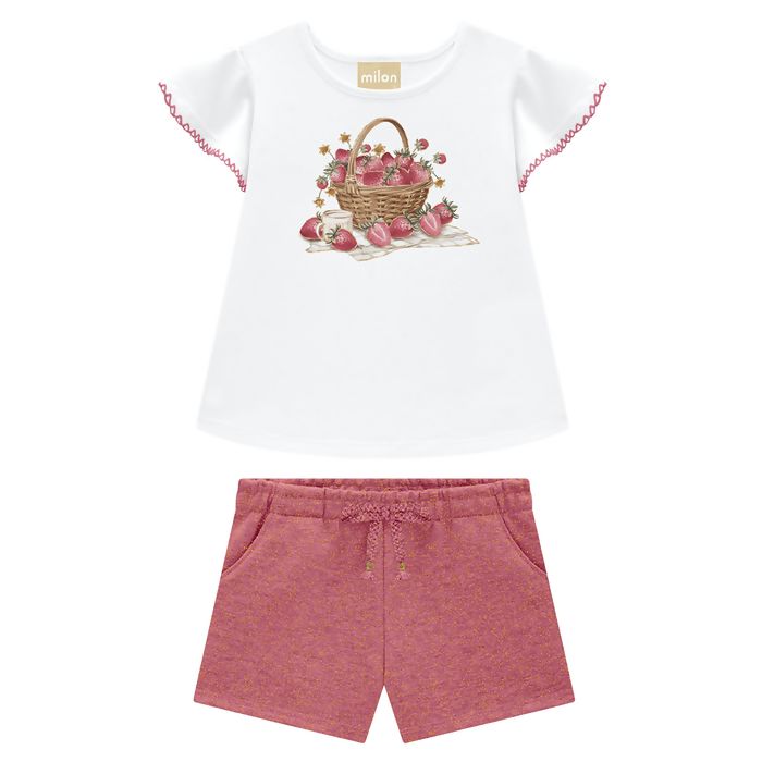 Conjunto feminino Milon, ideal para revenda, com blusa de cotton de mangas com picueta e estampa delicada de cesta com morangos, e short moletinho com brilho e cordão. Exclusividade da marca Milon, trazendo estilo e conforto para a coleção das suas clientes.