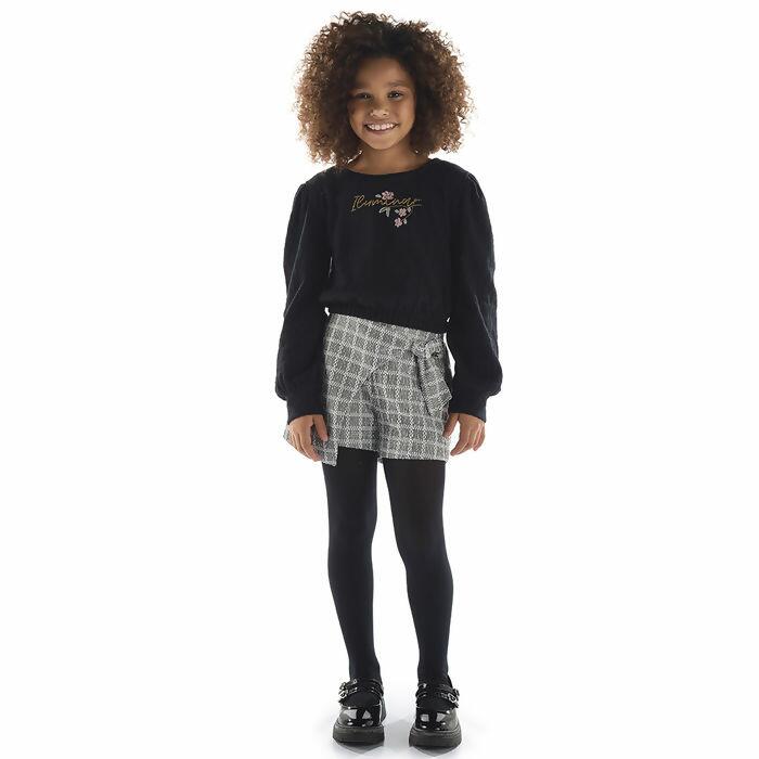 Conjunto infantil feminino encantador, perfeito para revendedores que buscam peças exclusivas e cheias de estilo. Blusa em malha texturizada com mangas bufantes, bordado delicado com a palavra 'Iluminar' e flores, combinada com shorts saia em malha tweed, oferece conforto e sofisticação. Ideal para atrair clientes que procuram roupas modernas e cheias de personalidade. Aproveite nossas condições de atacado e aumente seu portfólio com essa peça irresistível!