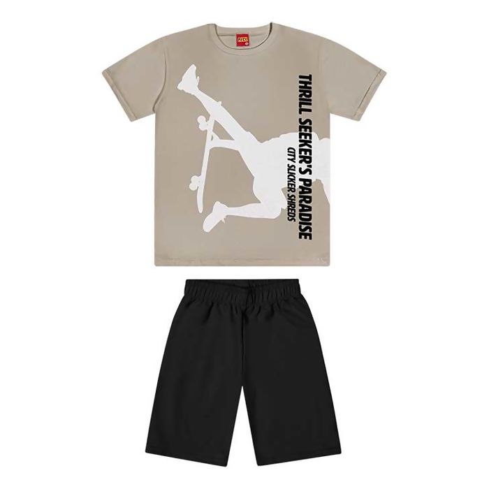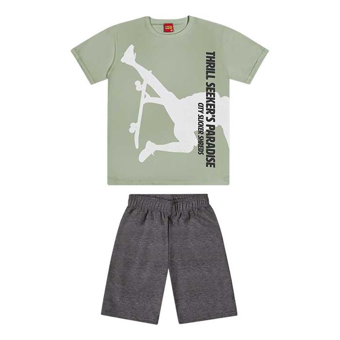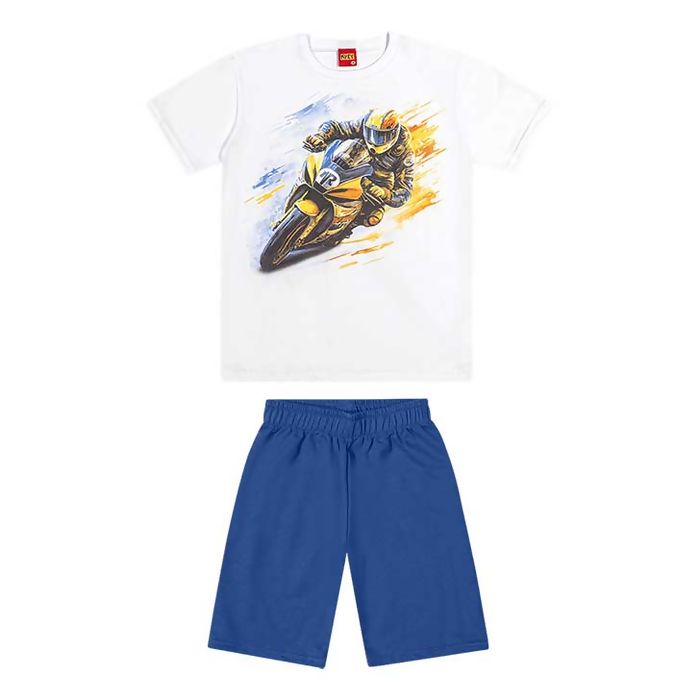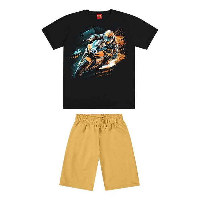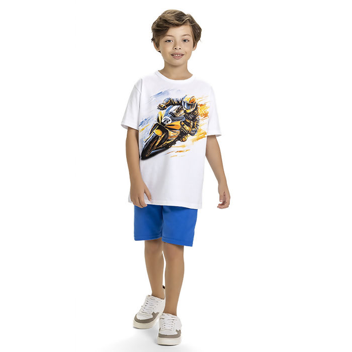Estilo e Conforto: Apresente aos seus clientes o conjunto exclusivo da Kyly, que combina malha leve e bermuda em moletinho sem felpa. Com estampas vibrantes de skater e moto, é a escolha ideal para quem deseja ousar com conforto e qualidade.