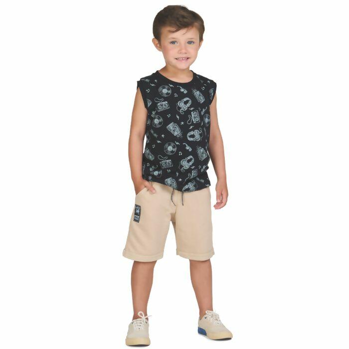 Conjunto infantil masculino composto por regata estampada em estilo urbano e bermuda em tom neutro com bolsos funcionais. Confortável e estiloso, é ideal para dias quentes e perfeito para lojistas que buscam peças versáteis e com ótimo custo-benefício.