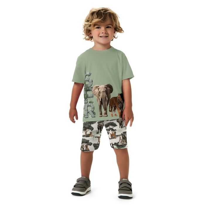 Conjunto masculino infantil com camiseta estampada e bermuda em modelagem confortável. Um modelo cheio de estilo, pensado para o dia a dia dos meninos que gostam de brincar e se divertir com liberdade.