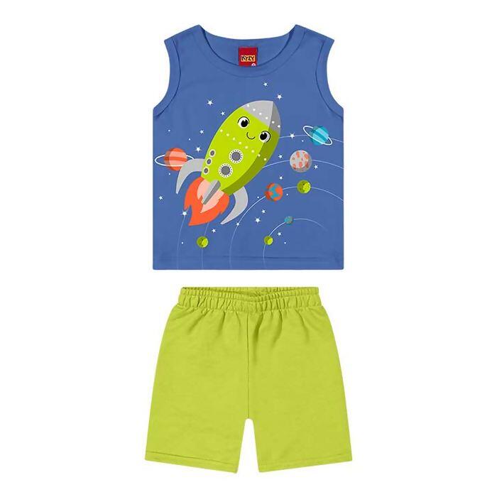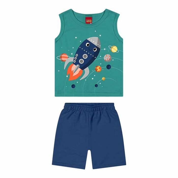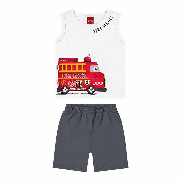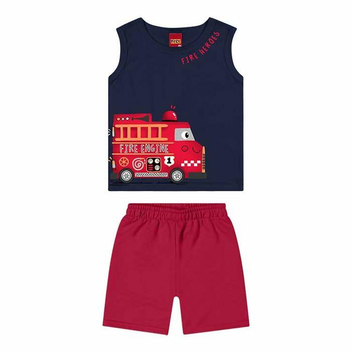 Conjunto Kyly Aventura: Leve a emoção para as lojas com nosso conjunto exclusivo da Kyly, que traz estampas de caminhão de bombeiro, trator e foguete. Confeccionado em malha leve e bermuda de moletinho sem felpa, é perfeito para crianças cheias de energia e estilo!