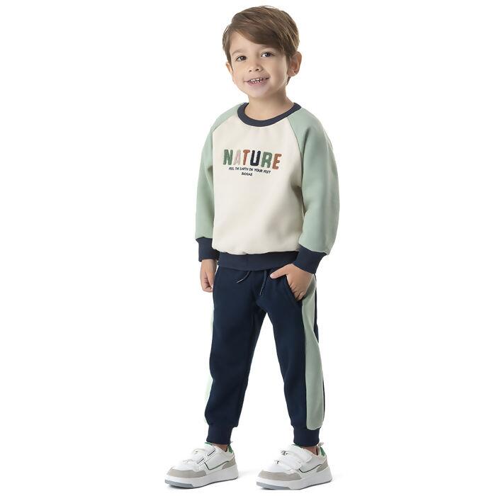 Conjunto masculino Biogás infantil, grade do 1 ao 3, com blusa em moletom gola careca e escrita NATURE central em alto relevo. Acompanha calça com cós reto, cordão ajustável e punho. Modelo confortável e moderno, ideal para compor vitrines com apelo urbano. Consulte nossa equipe de vendas. Dicas de estilo: combine com tênis ou jaqueta leve para um visual completo.