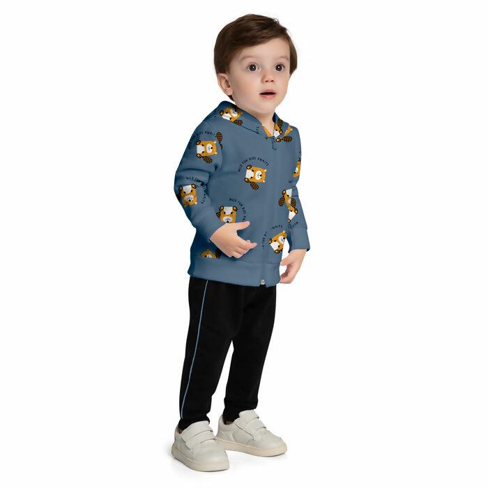 O Conjunto Infantil Masculino Kyly é perfeito para os pequenos aventureiros! A jaqueta em moletom peluciado apresenta uma estampa rotativa de castor e a frase "Wild Fun Ride Awaits", transmitindo um estilo divertido e cheio de personalidade. A calça moletom com punho garante um caimento confortável e ajustado. Uma peça exclusiva da marca Kyly, ideal para lojistas e revendedores que buscam qualidade e estilo no atacado!