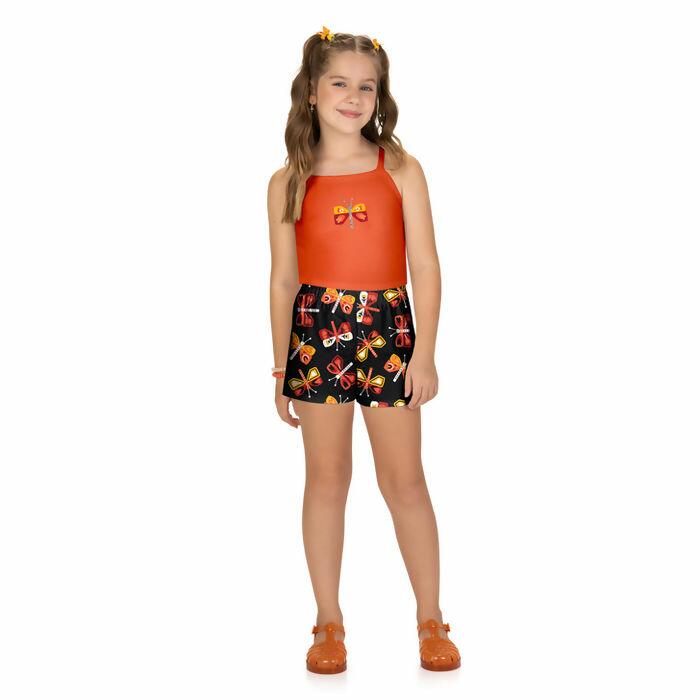 Conjunto Kyly juvenil feminino composto por blusa de alça com estampa de mariposa e peça inferior coordenada. Desenvolvido em tecido macio e confortável, garante elegância e praticidade. Peça sofisticada com ótimo potencial de giro no varejo.