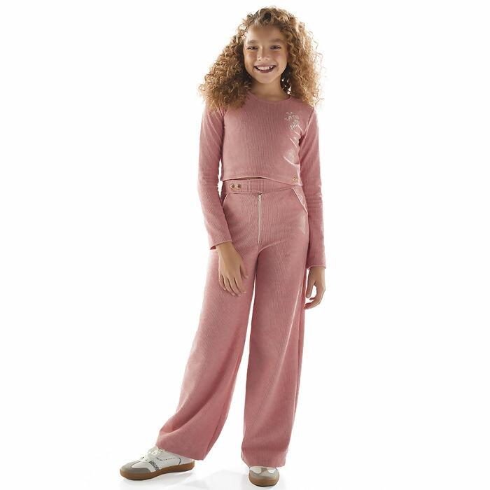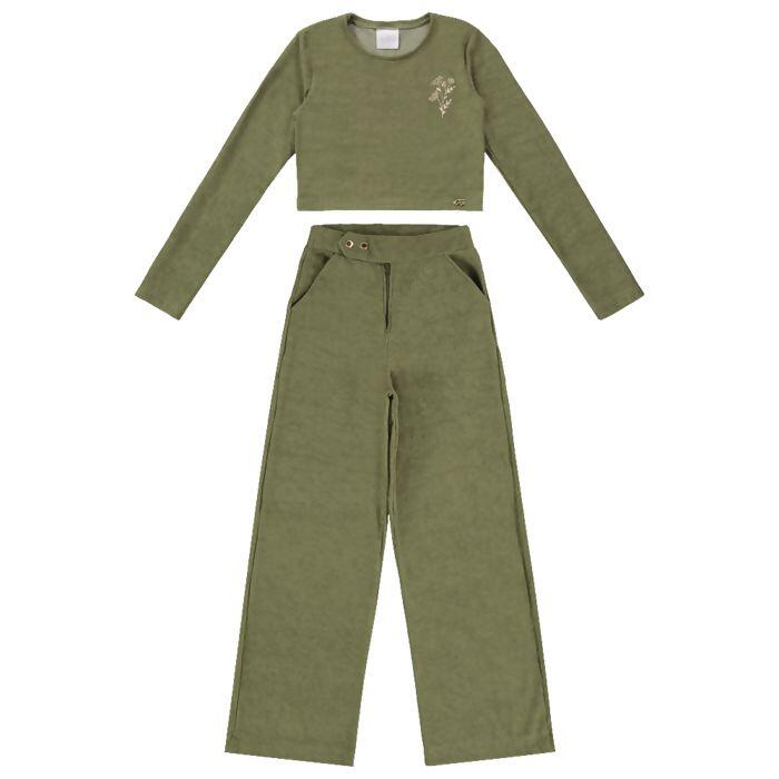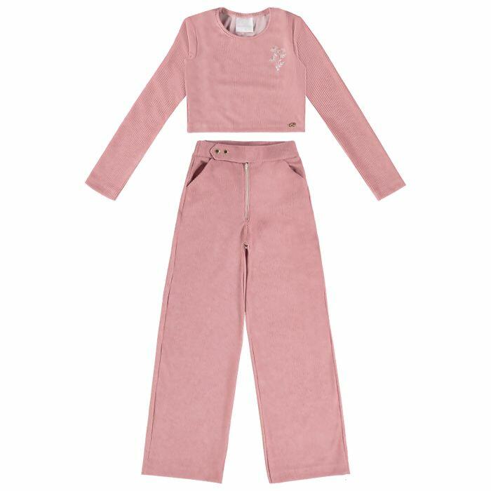 Conjunto Canelado Veludo com Blusa Manga Longa Bordada + Calça Wide Leg com Zíper e Botão ¿ Menina Anjo (12 ao 18)