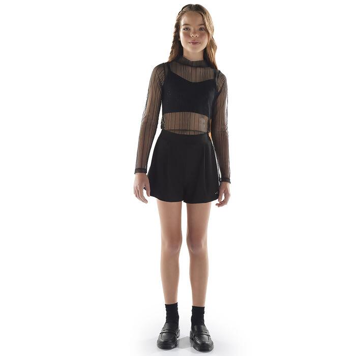 Conjunto 3 Peças: Blusa Transparente Tule Preto, Top de Alça Preto e Short ¿ Menina Anjo (12 ao 18)