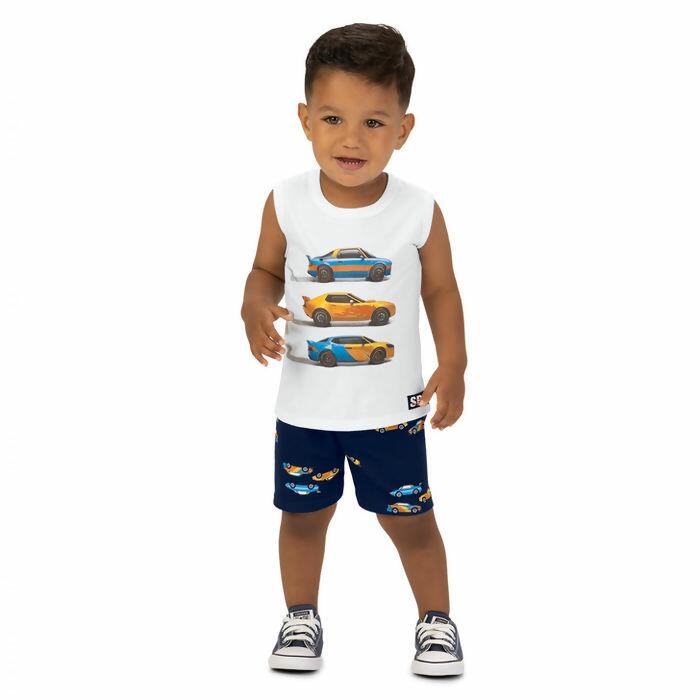 Conjunto Kyly primeiros passos masculino com estampa de carros, trazendo charme e conforto. Camiseta e bermuda confeccionadas em tecido macio, perfeitas para passeios ou atividades cotidianas.