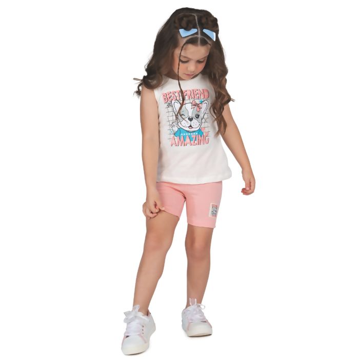 Conjunto feminino composto por shorts e blusa com estampa charmosa de cachorro.