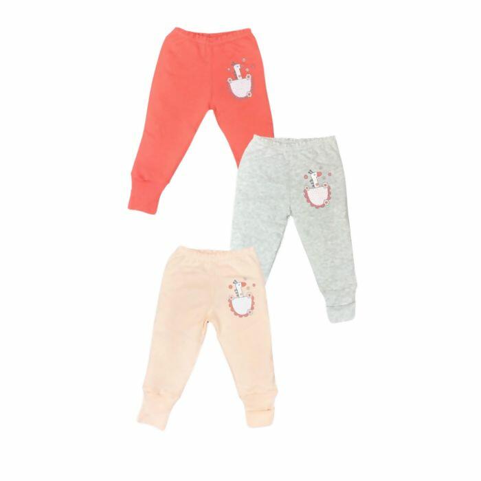 Kit com três calças em cores coordenadas com aplicação de girafa, confeccionadas em malha leve e macia, com cós elástico e punho na barra, garantindo conforto e praticidade. Peça essencial para compor enxovais e kits promocionais.