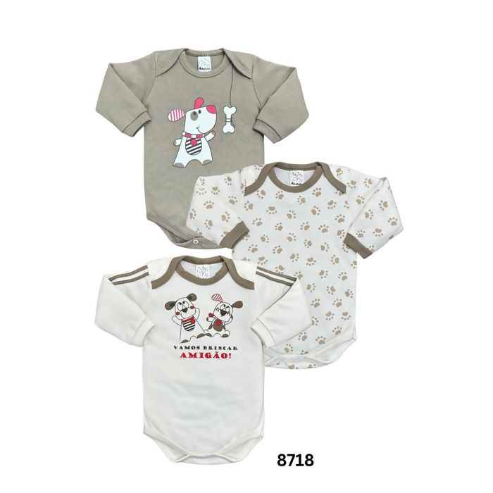 Kit com três bodies de manga longa confeccionados em material macio, proporcionando conforto e suavidade para a pele delicada do bebê. As peças garantem praticidade no dia a dia, com modelagem que facilita as trocas e oferece excelente vestibilidade. Um item essencial no enxoval, com alta rotatividade e ótima aceitação no ponto de venda.
