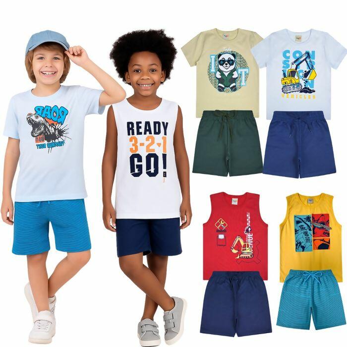 Kit com 12 conjuntos masculinos infantis, confeccionados em modelagens leves e confortáveis, ideais para os dias mais quentes. Produto versátil que garante excelente custo-benefício e amplia a variedade do mix de moda infantil.